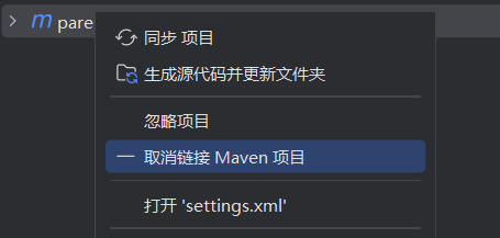 </parent>右边Maven设置,对父级取消链接Maven项目,重启Idea,点击右下角弹出的提示框,会重构父子关系
