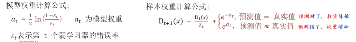 每轮训练后,预测错误的样本权重会升高,对的会降低,权重会传给下一个学习器